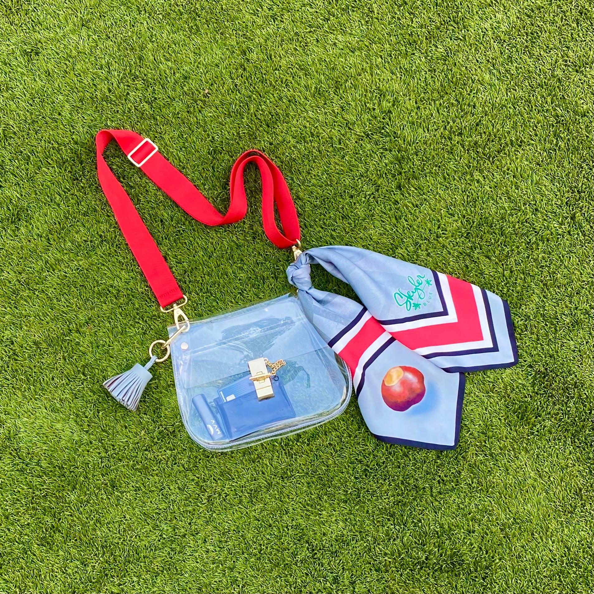 Looking for a stylish clear bag to wear to a stadium or event near you? The Skyler Blue Clear Medium Saddle Bag is the epitome of gameday couture. Wear it as an elegant clear purse or a sophisticated clear crossbody bag.